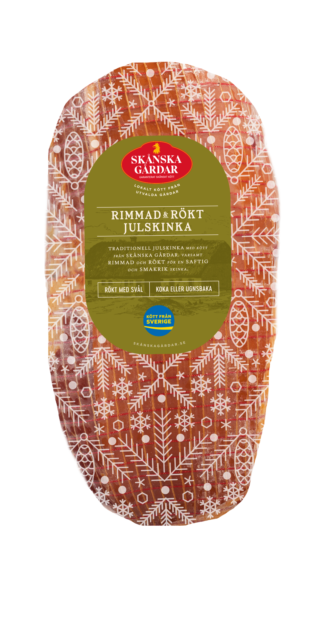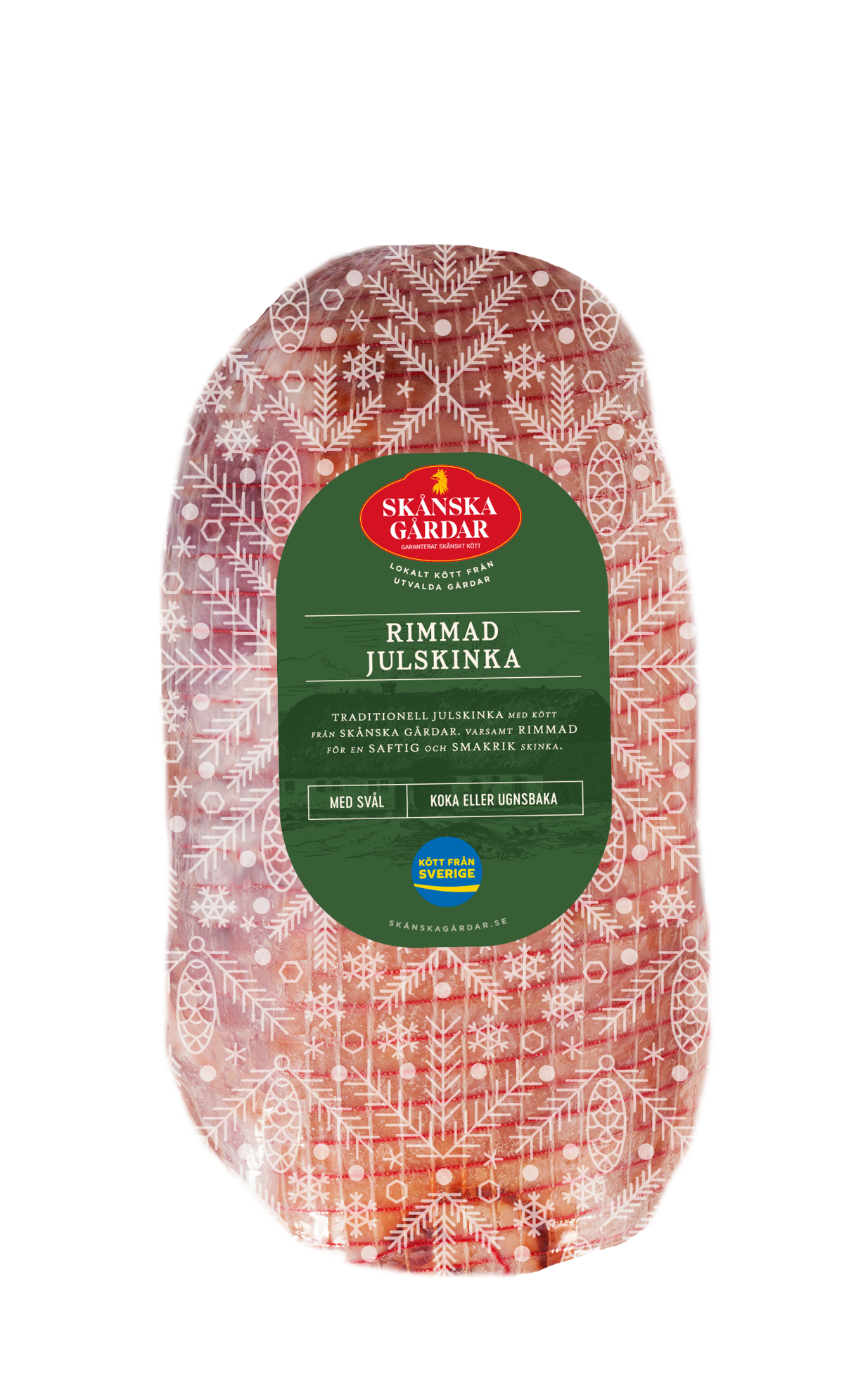 Julskinka x 3200 gSkånska gårdar erbjuder dig en julskinka med lokalt och närproducerat svenskt kött, där djuren är födda och uppfödda på gårdarna runt om i Skåne. Kom i julstämning med vår färska och rimmade julskinka med svål! Koka eller baka i ugn till en innertemperatur på 70°C. Avlägsna nät och svål, pensla skinkan med uppvispad äggula och senap, täck med ströbröd och griljera sedan i ugnen på 225°C tills den fått fin färg.
